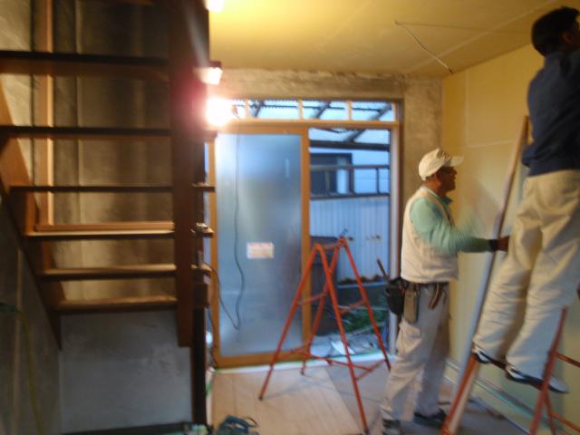 | 天井も、下地ごと新しく施工します。 | 古い木製建具の窓は取り払い、アルミ樹脂複合の断熱サッシにします | いよいよ壁のボードを張り、大工仕事もクライマックスです |