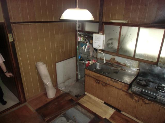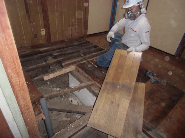 | キッチンの床を壊していきます。 根太や土台も、シロアリにやられているところがあるのですべて取り除きます。 |