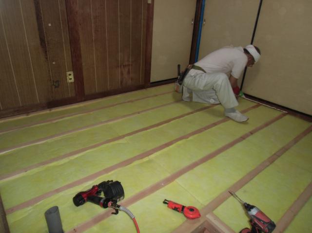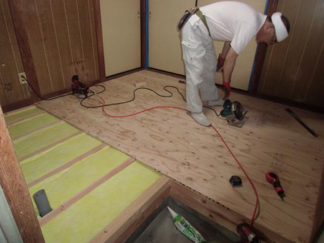 | 土台の代わりに大引を基礎へ固定します。そのときに使うのがアンカーです。 | 大引と根太を敷いて、しっかりと固定したら、断熱材を入れていきました。 | 断熱材を入れた後は、コンパネを張っていきます。 |