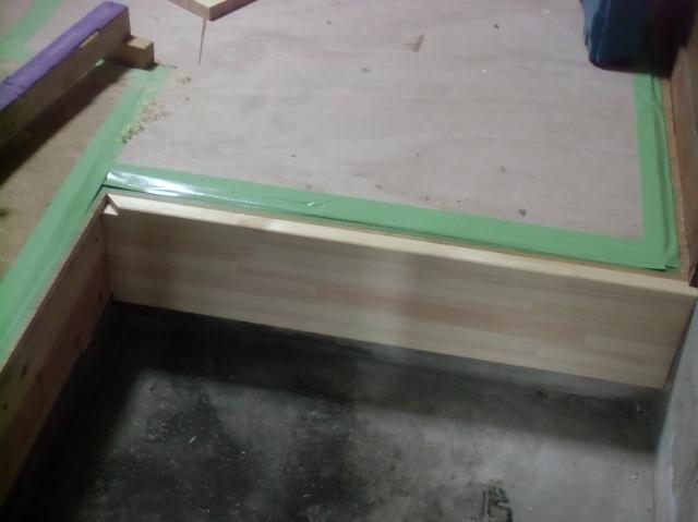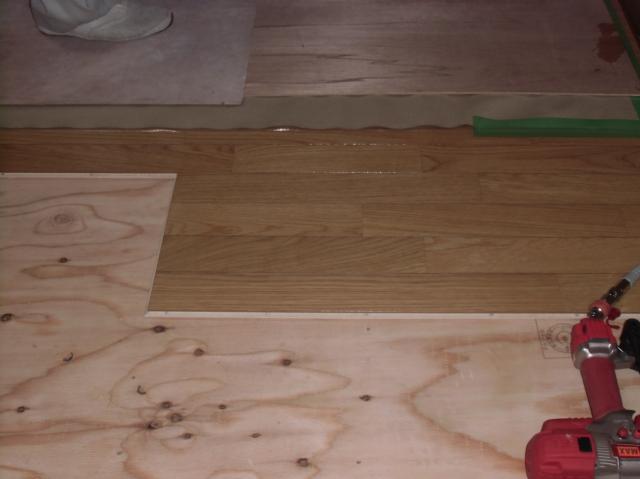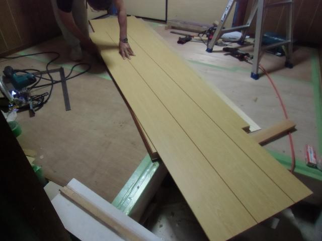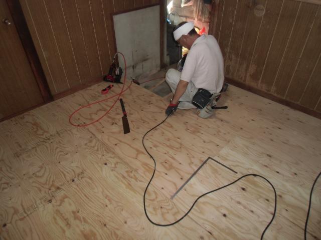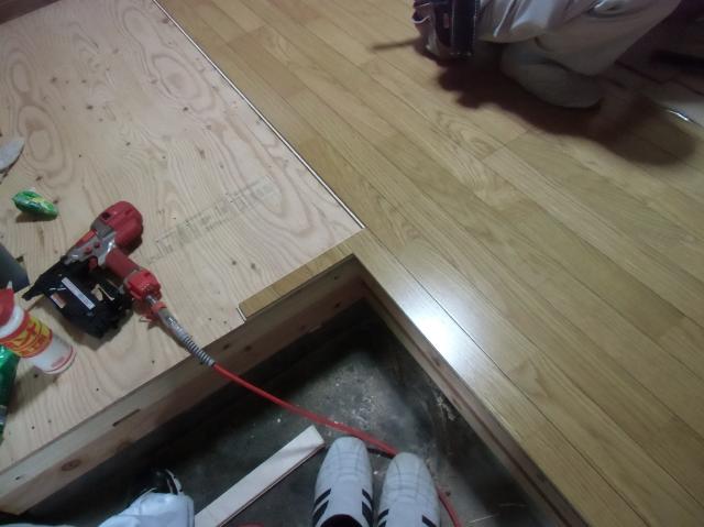 | 床一面に張っていきました。 | フローリングを張り詰めていき、二重張りになります。 | こんな風に框(かまち)部分も丁寧にやっていきます。 |