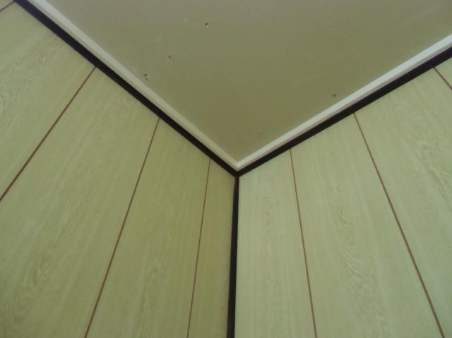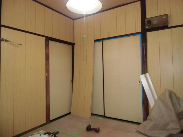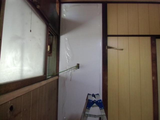 | これは框として利用しました集製材です。 | これから壁を張っていきます。既存の壁を下地にして新しい壁を貼り付けていきます。 | プリントと呼んでいます、薄い合板です。下地にしっかりと固定していきます。 |