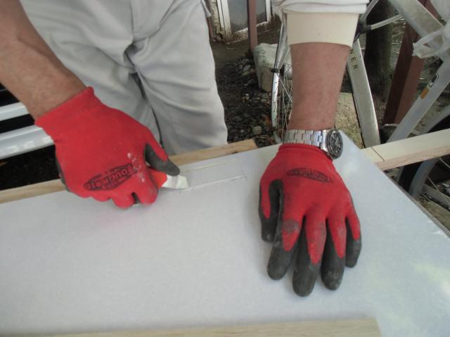 | 開きました。養生のビニールが張ってあるので、マジックで書いたところは、消さなくても大丈夫です。 | ガスコンロのサイド壁に、こんな感じに張っていきます。 | 張るには強力な両面テープとシリコンでしっかりと張っていきます。 |