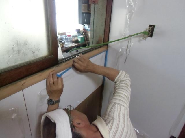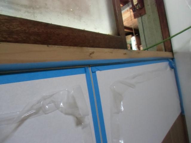 | キッチンパネルの縁に青い養生テープを張っていきます。 | これはコーキングを施すので、養生をしていきます。 | 新しく回り縁も付けました。 |
