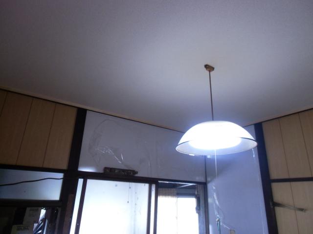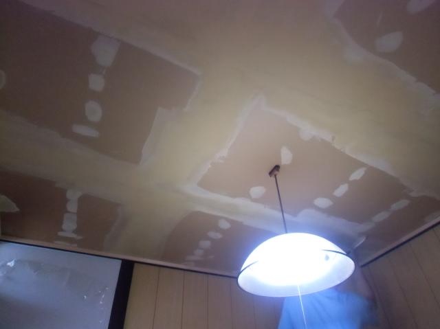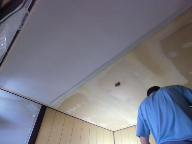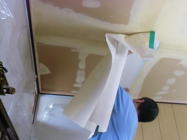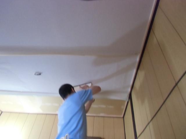 | ここからは、内装屋さんに天井のクロスを張っていただきます。 | パテを塗って乾くまで時間がかかりましたが乾いたらもう早いです。 | ビシッとしわもなく張っていきます。 |