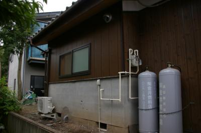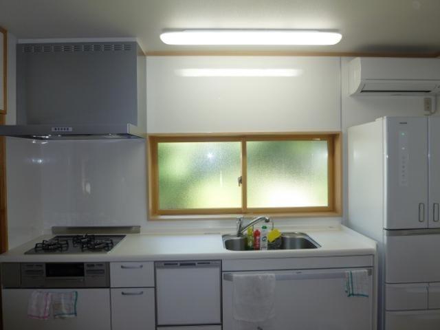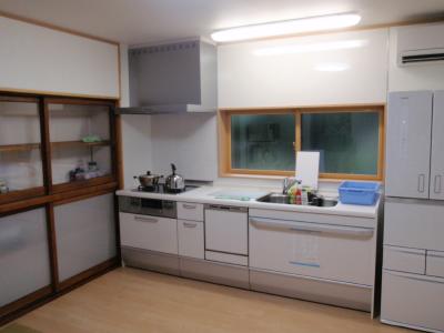 | キッチン完成、隣の組み込みの食器棚は残して欲しいと言うことで、下のガラスに乳白のガラスフィルムを貼り目隠しに。 | 廊下側に明かりが受けるように、ガラス面を大きな物にしました。 | 外回りは、似たような外観に仕上げました。廻りの既存部分に溶け込んで、新規工事部分が目立ちません。 |