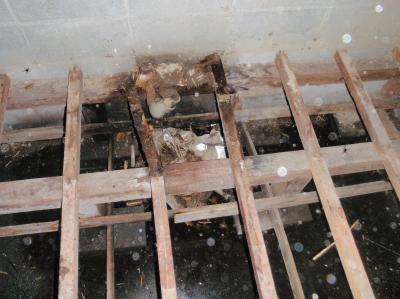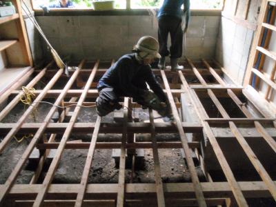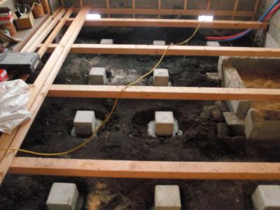| 床をこわしてビックリ!キッチンの排水がはずれていて、床下はヘドロ状態でした。 | 新たに束石を設置します。 | 大引も根太も全て新規に施工します。 |