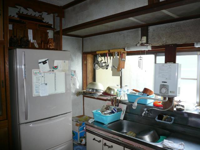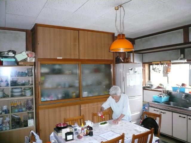 | 壁が塗り壁だったせいもあり、長年の油や誇りを吸い込み暗いイメージのキッチンでした。 | キッチンから居間、廊下に繋がる部分です。左側はムロが有る漬物部屋です。 | 三世帯同居ですので、食器類も多く物が溢れています。 |