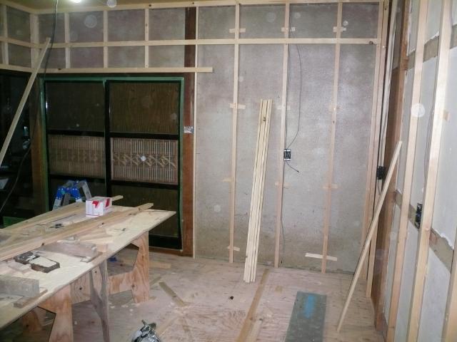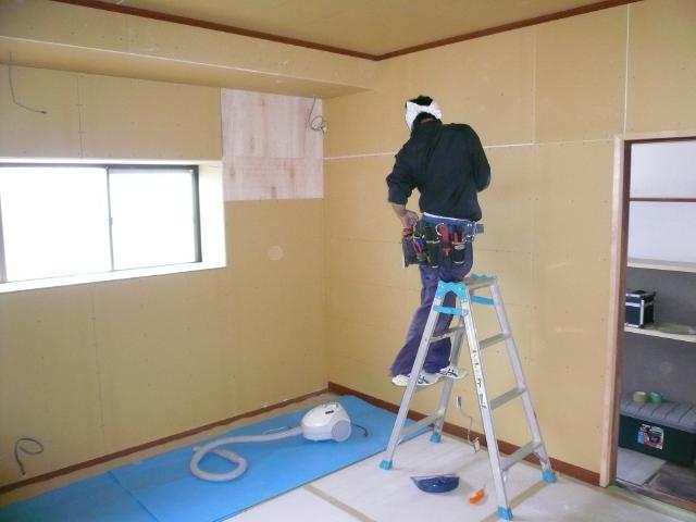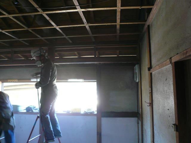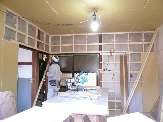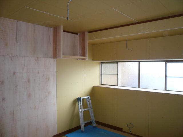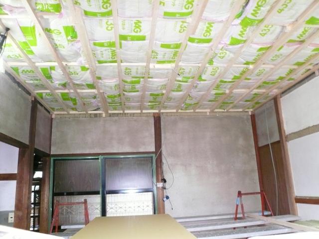 | 以前は天井に断熱材も入っていませんでしたが、隙間無く16Kgの断熱材を敷き込んでいきます。これで冬の暖房効率も変わっていきます。 | せっかくの土壁は生かして新しく壁の下地を組んでいきます。キッチンや壁付収納が着くので壁の倒れを修正していきます。 | 吊り戸棚や家電収納を設置する箇所はベニヤを張り、そのほかは石膏ボードを張ります。 |