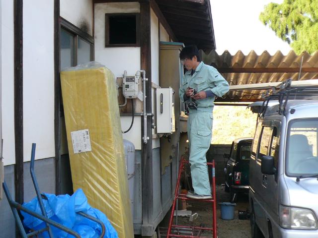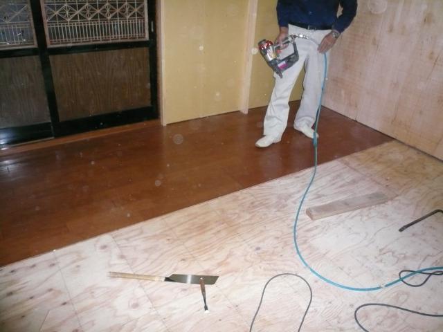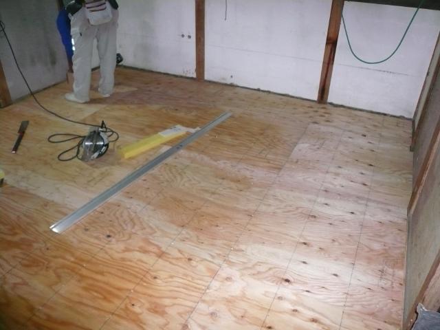 | 壁と天井を張り終えたら、いよいよ床のフローリングを張っていきます。最後にフローリングを張るのは、少しでも傷をつけないようにするためです。 | 今までは室内に瞬間湯沸かし器でしたが危険な為、外部に16号の台所専用の給湯器を設置しました。 | フローリングも張り終わり養生をして、今度は電気屋さんが、配線した箇所の電線を取り出す作業をしています。 |