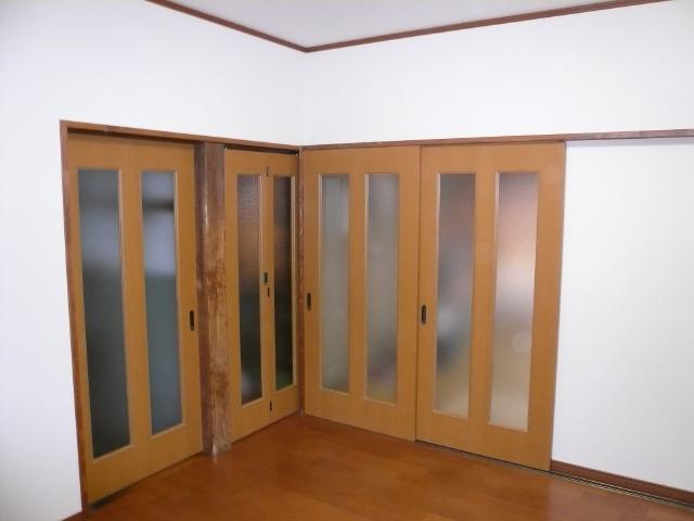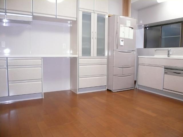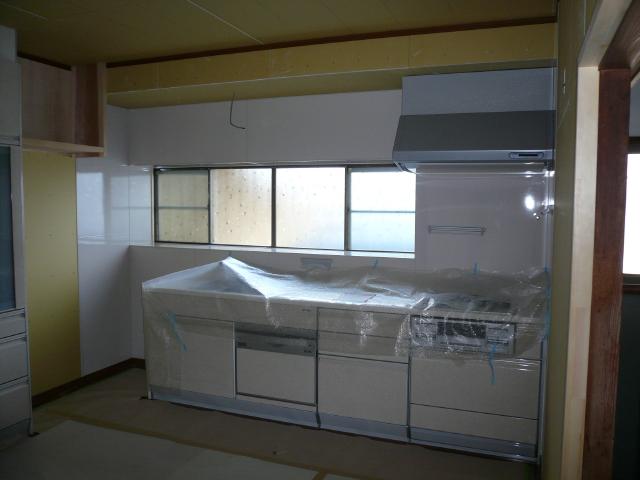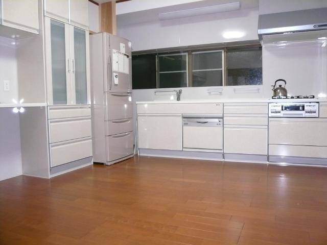 | お客様からの希望で、キッチンから居間の入り口は夏場開放的に出来るように、2枚建ての引き込み戸にしました。 | キッチンの扉などは白を基調にしたので、床のフローリングは少し落ち着いたイメージの色を選びました。 | キッチンは食器洗浄器を組み込み、電子レンジや炊飯器は食器棚に併設のカウンターに置く事で、動線をコンパクトにしています。 |