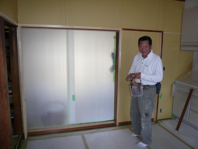| 後はキッチンを据えて、壁と天井の仕上げをすれば終わりの段階です。奥様も毎日少しずつ変化していくので、楽しみのされているようです。 | 木枠部分の塗装工事です。古い柱の色に合わせ色を現場で作ります。長年の経験で、色も一回で合わせることが出来ました。 | キッチンを据えつけ終わったところです。朝4tトラック一台分の材料を搬入し、一日で組み立てていきます。後はクロスを貼れば完成です。 |
