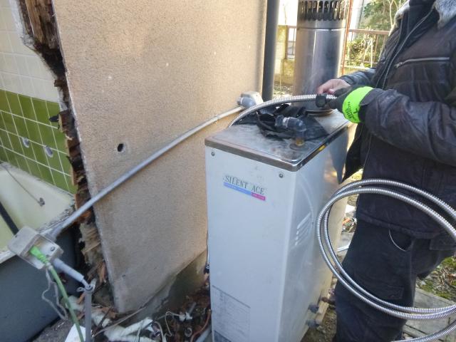 | お風呂を解体します。手際よく壊していき、一日で解体は終わらせます。 | 湯船を出すため、周りも壊していきます。思いの外、腐食箇所が多く見受けられます。 | 設備屋さんには配管と古い管の撤去をしてもらいます。キッチンのお湯は使用できるようにします。 |