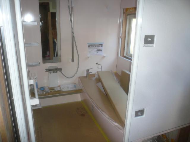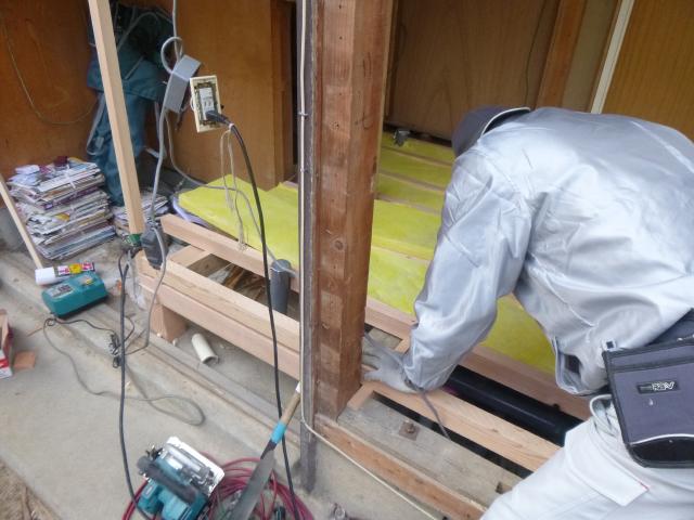 | ユニットバスの組立がほぼ終わりました。 | 最後にコーキングをして終わりです。 | 脱衣室の床に断熱材を充填していきます。 |