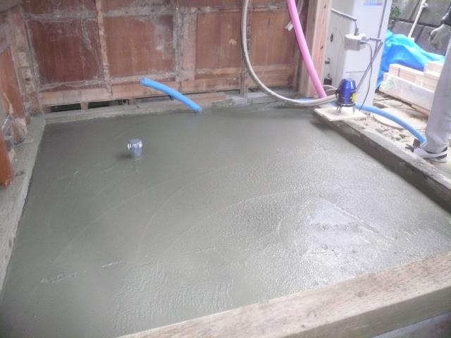 | 撤去が終わりました。脱衣室側の配管が複雑なので、明日は配管の切り廻しをします。 | 土台がシロアリによってほぼ無くなっていたので、新たに入れました。そして土間も打ち終わりました。 | ユニットバスの組立です。浴槽も保温浴槽になっています |