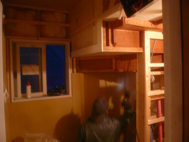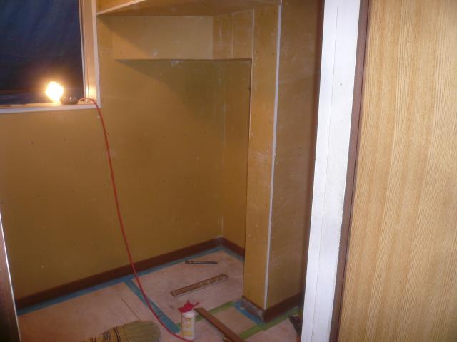 | 脱衣室の壁を造っていきます。階段下の仕上げをしていきます。 | 脱衣室の造作が終わりました。後は内装の仕上げをします。 | 内装工事で、クロスの下地を作っていきます。角が多いので、施工は大変です。 |