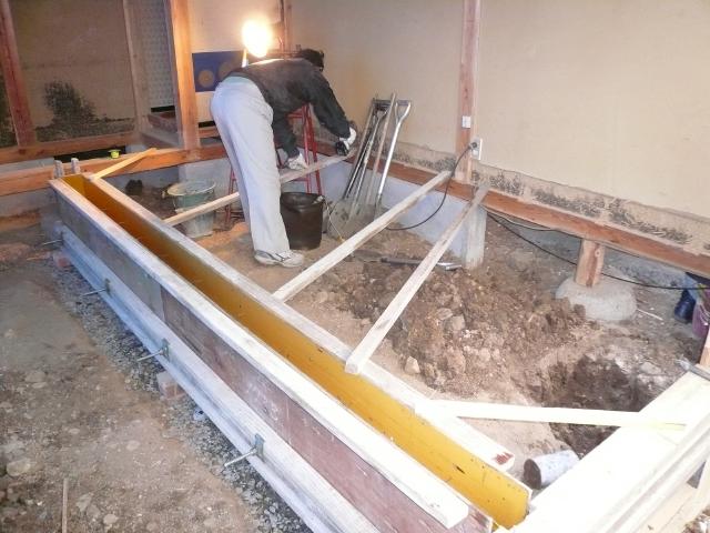 | 解体工事です。天井と間仕切り、床を順序良く壊していきます。土壁なので現場はマスクをしていないと、鼻の中まで真っ黒になります。 | 何もなくなった状態です。基礎にクラックや、土台にシロアリ被害がないか等チェックをしておきます。 | 浴室と和室の間仕切り部分の布基礎を組んでいます。この後ユニットバスを据える箇所は土間コンクリートにします。 |