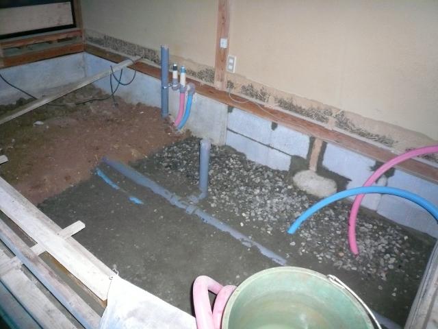 | ユニットバスと洗面脱衣室になるので排水管とお湯、水の配管をしておきます。近年は錆や漏水の恐れの少ない樹脂管を使います。 | 配管が終わったらユニットバスの設置部分は、土間コンクリートを打ちます。今回は少量なので現場で練りながらの打設です。 | 大工さんが間仕切りや床の下地の大引きを据えていきます。シロアリ被害の少ない桧の材木を使用します。 |