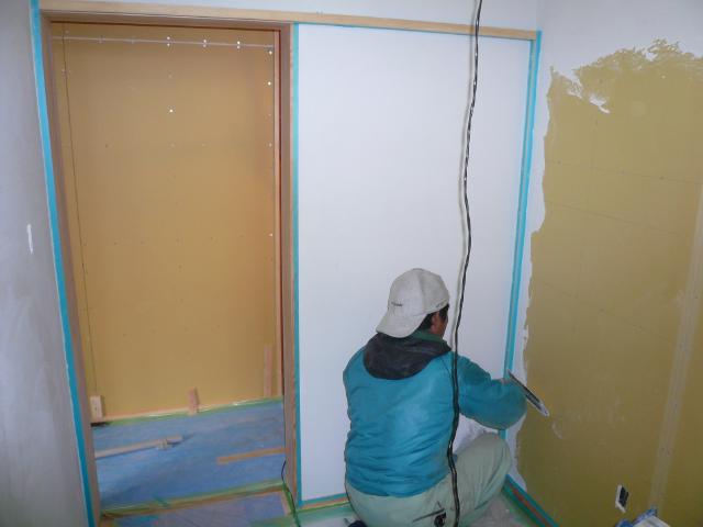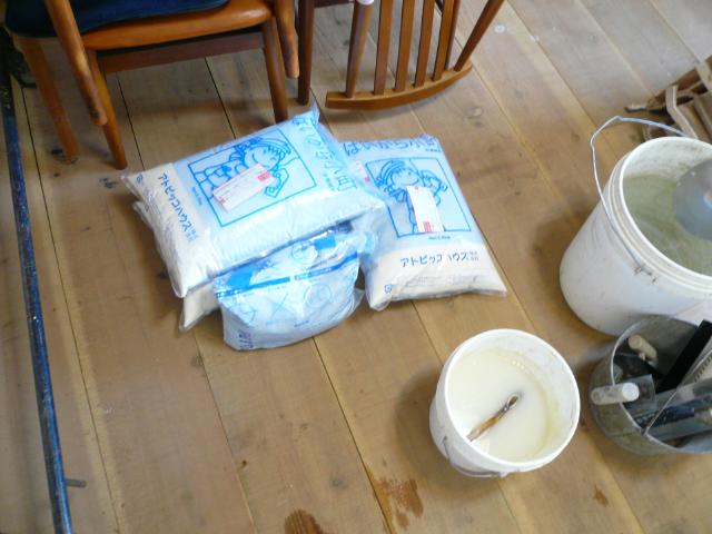 | 壁の仕上げです。予定はビニールクロスでしたが、自然素材にこだわって壁は珪藻土を使うことにしました。今は下地材を塗っています。 | 壁の仕上げ材の「はいから小町」です。100%自然素材で、調湿効果に優れています。小さいお子様が口に入れても、健康被害は有りません。 | 脱衣室はこだわって仕上げ材は、全て自然素材で仕上げています。床に張ったムクのナラ材の木目も綺麗です。 |