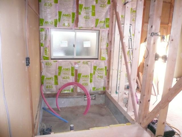 | 浴室のサッシを入れて、外壁廻りの造作をします。北面は鉄板サイディングを張るので、防水紙を張り下地もしておきます。 | 外壁面の断熱材を入れ、新しい間仕切りは筋交いと金物で柱と土台、桁を連結補強して明日、ユニットバスを据える準備は終わりです。 | ユニットバスの据付ですが、職人は2人コンビで一日で据え付けていきます。壁に手摺を付けるので、位置を出して加工しておきます。 |