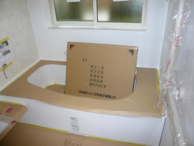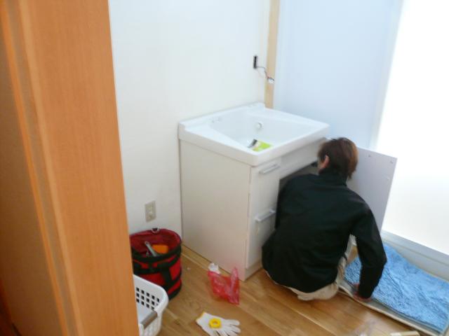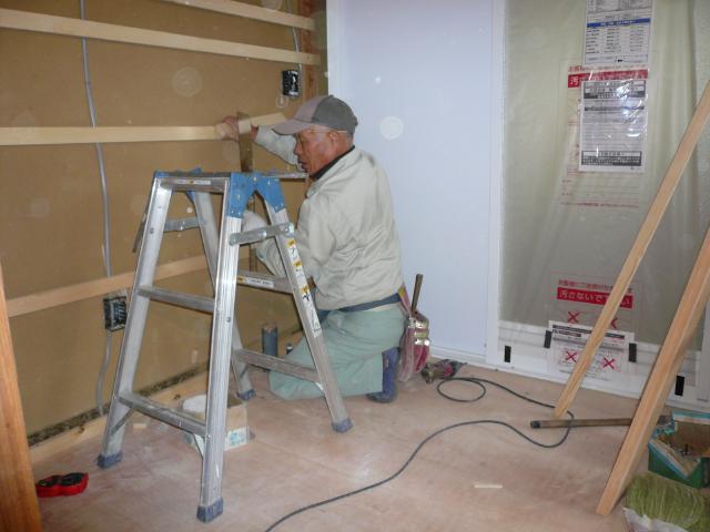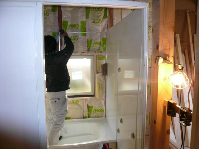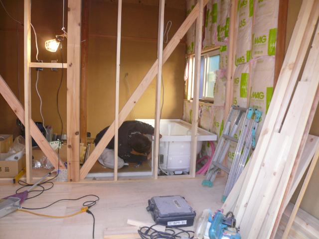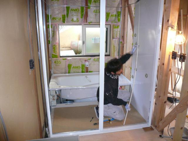 | 外壁面の壁パネルを組み立ててます。パネルのジョイント部分は、コーキングを使わずに専用部材なので、カビもつきにくくなっています。 | ユニットバスの完成ですが、夕方5時には終わりました。引渡しまで傷や汚れが着かない様に、ダンボールや養生材で保護をしておきます。 | 大工さんが、洗面脱衣室の壁の下地を組んで造作をします。床はナラのムク材を張るり、天井は布クロスを貼る予定です。 |
