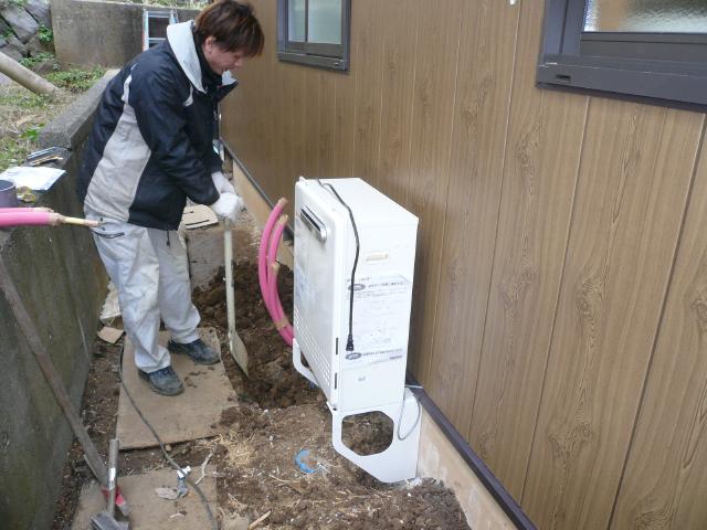 | 洗面化粧台を取り付けます。排水とお湯、水の配管を結びこんで通水をすれば中の工事は終わります。 | 外壁の鉄板サイディングを張っていきます。ウレタン付きのサイディングなので、保温性もあります。作業している間、脇をサルが通っていきました。 | エコジョーズの24号の給湯器の取り付けです。ランニングコストが一般のガス給湯器よりも押さえられます。 |