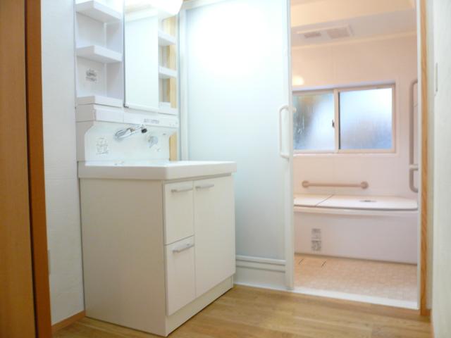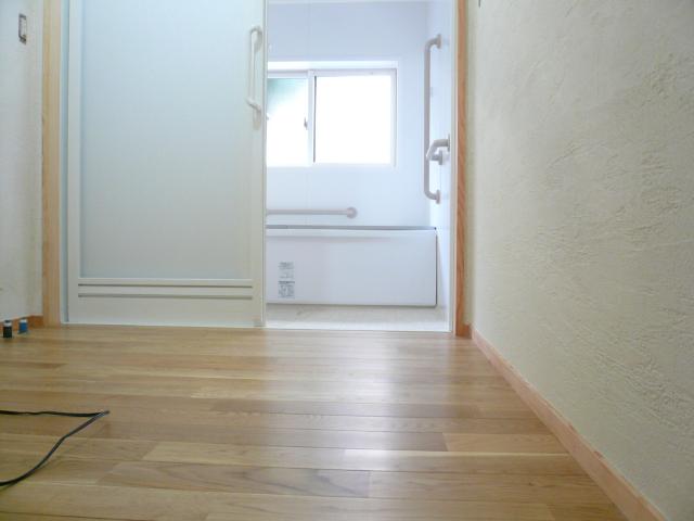 | 8帖+広縁の部屋の一部を寝室にする計画で、6帖程度の広さで良いと言うお話だったのでその残りのスペースに、洗面脱衣室と浴室を増設すれば寝室も近いしおばあちゃんの部屋からもスムーズに行ける様になります。浴室は寒さを考えて、浴室暖房を組み込んでます。息子さんは帰りが遅い時が度々有るようでしたので、ボイラーもフルオートの給湯器を選んであります。ランニングコストを考慮してエコジョーズにしてあります。 |