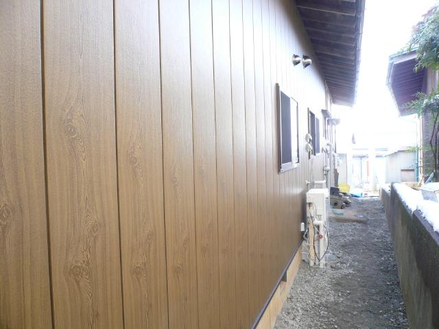 | おばあちゃんが安心してお風呂に入れるように、各所に手摺を付けてあります。窓は小さいのですが、壁のパネルが白いので充分明るく感じます。 | 廊下から脱衣室に入る扉も、使いやすい片引き戸にして有ります。浴室の窓から差した光が、廊下に届くように大き目のガラスにしてあります。 | 外壁も木目調のサイディングにしましたので、和風の住宅でも雰囲気が合います。砕石も敷き込んであるので、ぬかる事もありません。 |