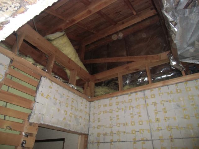 | 床も壊して、ベト、ガレキ、風呂桶を外に出していきます。陶器は重たいです。 | 天井も壊して造作むき出しです。 | 脱衣から200ミリほど下げました。ユニットバスの寸法もありますので、今回は200下げました。ご家庭によって変わります。 |