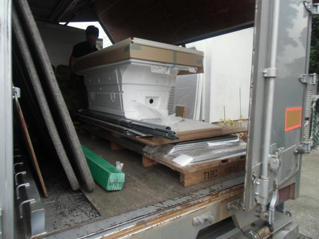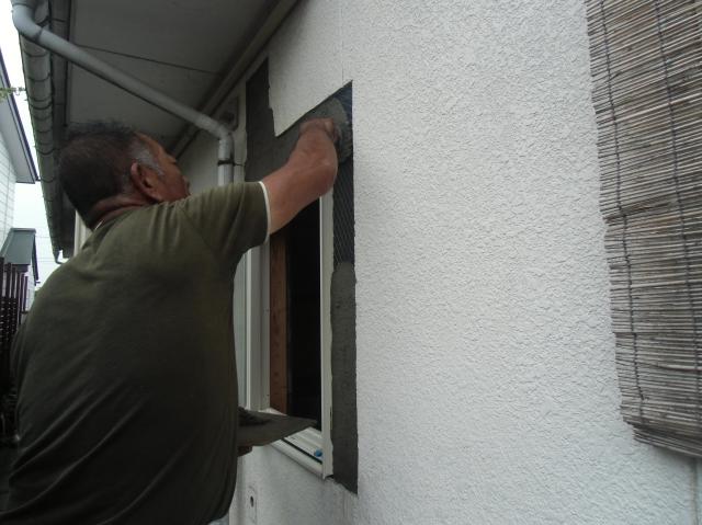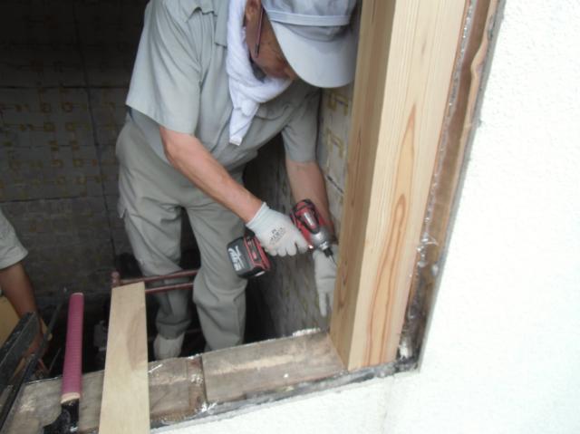 | 木工事です。窓枠を作っていきます。 | 新しい窓枠を作って、サッシをはめ込んでいきます。モルタルを塗るので、この後ガラというものもしっかり入れます。 | ユニットバスが届きました! |