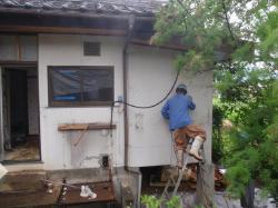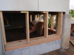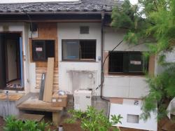 | オイルタンクを撤去して、窓の位置を解体します。 | 室内側から見た状況ですが、広い庭に大きな木が生え、とってもいい環境です。普通の住宅では考えられません | 下は何もありません、そのまま外 この時期は蚊がいっぱいいて、悩まされます。 |