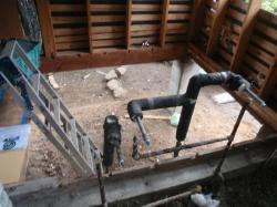 | 古いオイルタンクが有り、これも取り換えましょうと工事が始まってからご提案させて頂きました。 古い給湯機に、井戸水やら、使われていない不凍栓がやたら・・・ |