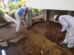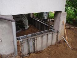 いろいろな配管がごちゃごちゃで、勝手口から出た階段も、踏みしろが狭く、蹴上の高さもバラバラ、ブロックを置いたり、板を置いたりと、歩きづらいと言うより、危険な状態でした。 | 風呂を作る場所ですが、下ががらんどうの穴あき状態、ただ外から物を突っ込むだけの状態でした。 何とかしたいですね。 |