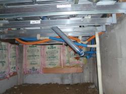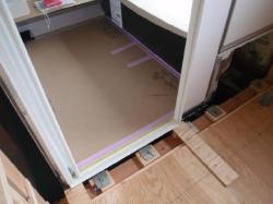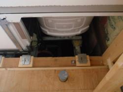 サッシを取付、給湯機も設置、ユニットバスを組みます。 | 普通jの家では見ることの出来ない、ユニットバスの下側。 |