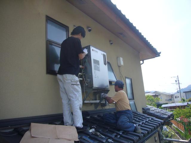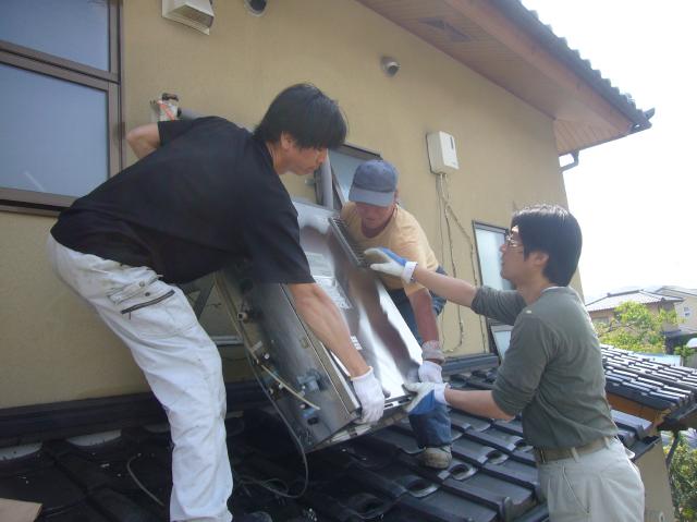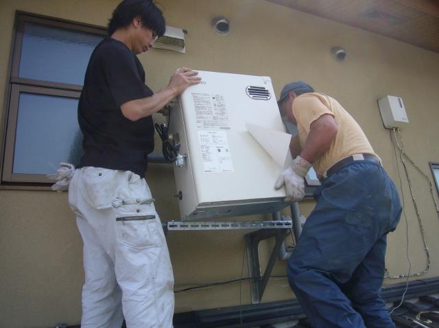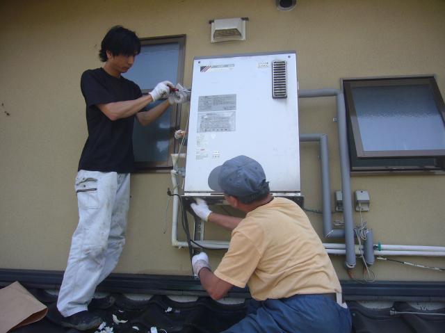 | 接続配管、保温材、取り付けネジすべて取り外します。 | 二階の屋根なので、三人がかりで下ろし、新しい給湯器も3人がかりで上げます。 | 給湯器本体の撤去が完了しました。 |
