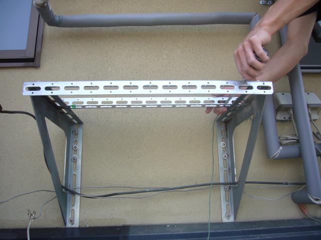 | 今度は、給湯専用機を設置するので、追い焚きの循環パイプはいらないので外します。 | 新しい給湯器はサイズが大分小さくなるので、今までの架台と合いません。アングルで調整します | 新しい給湯器を架台に載せます。 |