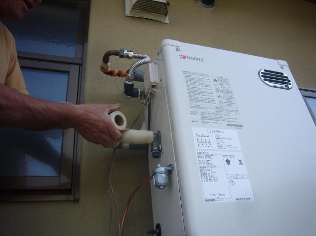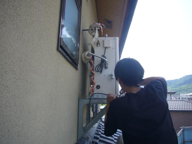 2階の屋根の上に設置してあります。 | 給湯器周囲の接続配管を切り離します。 |