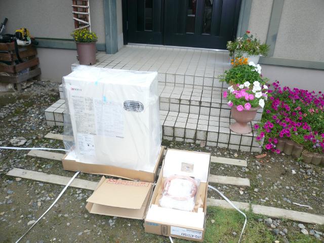 | 新しい給湯器です。4,000k/calのオートです。生産も通常に戻り数日で間に合うように成りました。 | 架台を調整して、新しい給湯器をセットしたところです。コンパクトに成っています。 | 給湯器と配管の接続部分の材料です。今回はフレキ管を使用します。 |