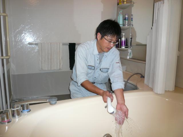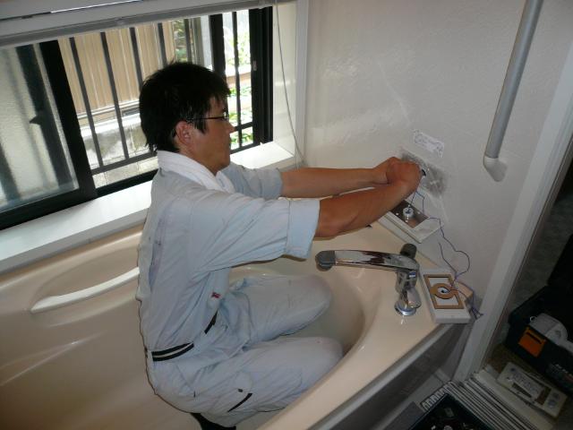 | 浴室リモコンの付け替えをします。以前のリモコンと大きさは同じです。 | 新しい給湯器の試運転をします。お湯はり試験も行い不具合がないか確かめます。 | 約半日で給湯器の取替えが終わりました。これで安心して使っていただけます。 |