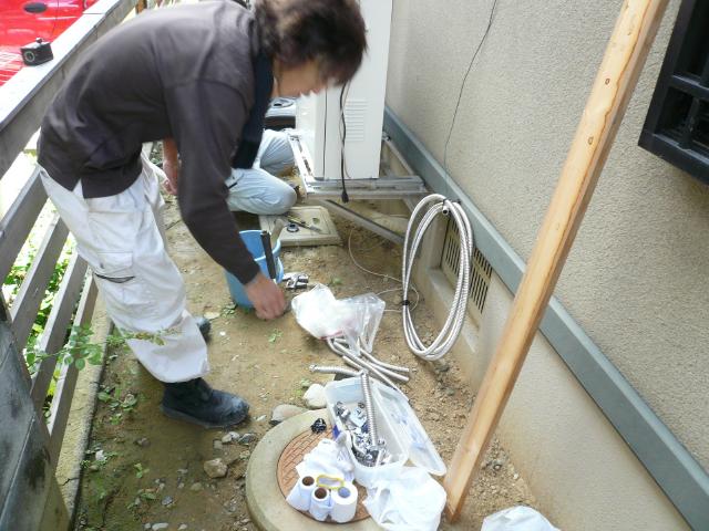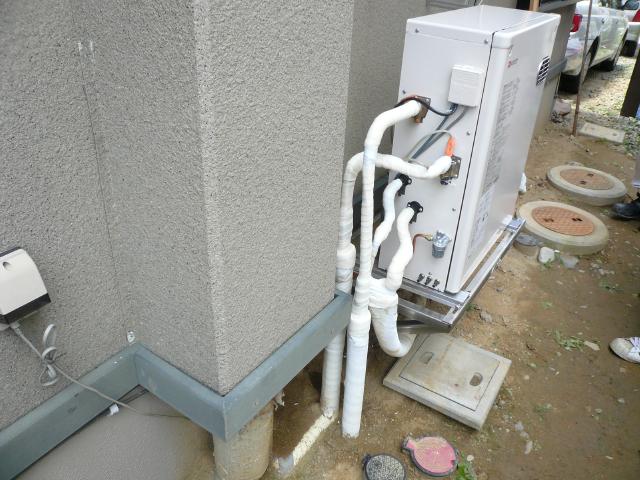 | 給湯器の位置に合わせ、配管を接続していきます。閉め忘れがないよう充分に配慮します。 | 配管が全て給湯器に繋ぎ終りました。凍結ヒーターを巻いていきます。 | 配管を繋げたあとは凍結ヒーターに保温材を巻いていきます。 |