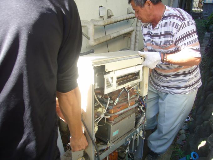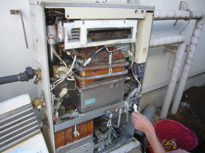 | いつものように給湯器本体を取り外すために、周囲の配管を切り離します。 | カバーを開けて中を見ると、少しづつ水が漏れていたらしく錆付きが目立ちます。 | 本体の取り外し。 |