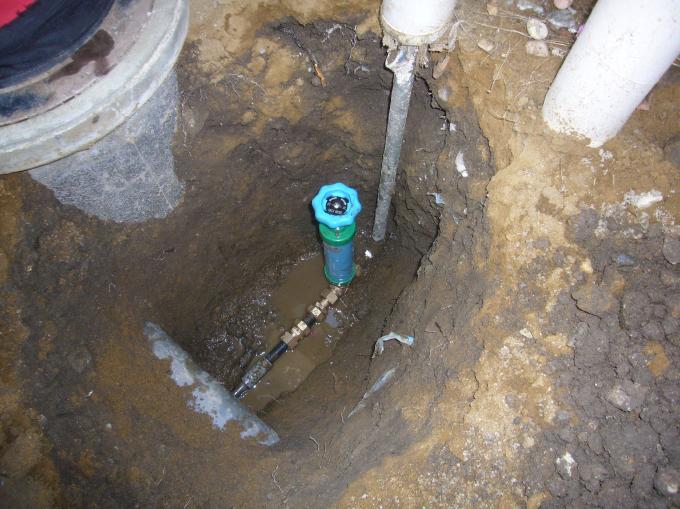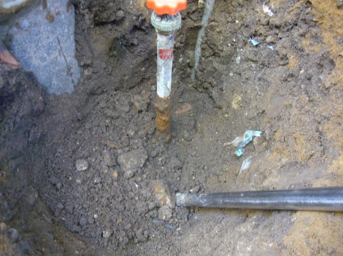 | 新設のふろ沸かし循環パイプにも凍結防止ヒーターを巻きます。 | 全く回らなくなってしまった水抜き栓を取替えます。下部が錆びています。 | 土中の接続部分も取り替えて、水抜き栓を取り付けました。 |