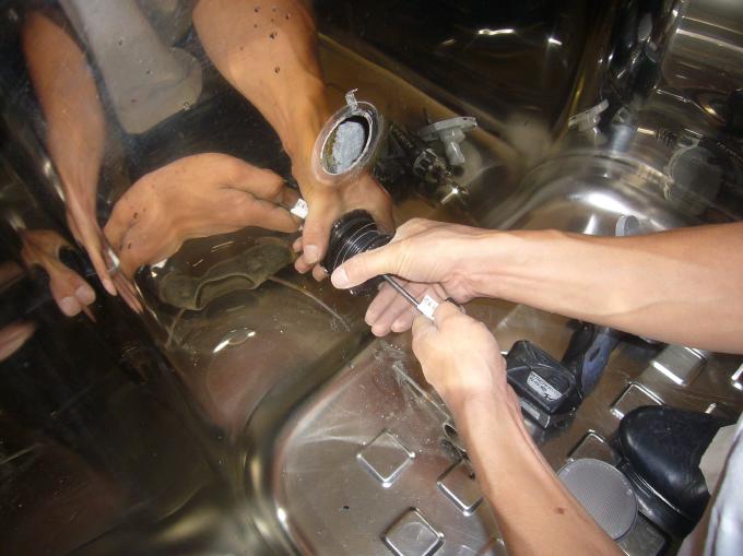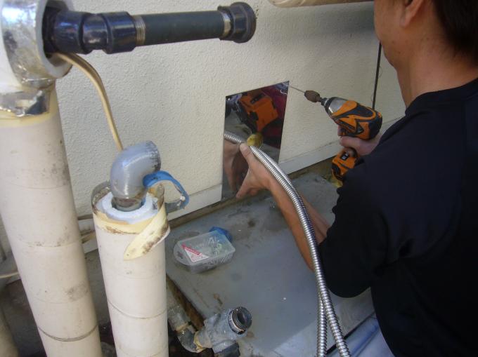 | 給湯器の撤去完了しました。 | 浴槽内の二つ穴を一つ穴に改修します。循環パイプを取り外します。 | 新しく循環パイプを取付けて、いままで穴が開いていた外部に化粧カバーを取付けます。 |