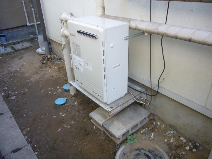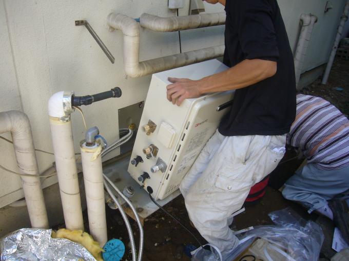 | ふろ沸かし用循環パイプを取付けました。 | いよいよ本体を設置します。今までの物よりだいぶ小さくなりました。 | 都市ガスの接続を長野都市ガスさんにお願いしました。 |