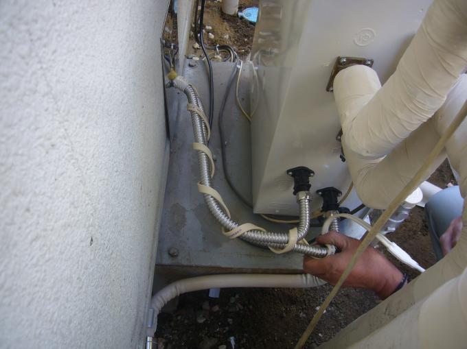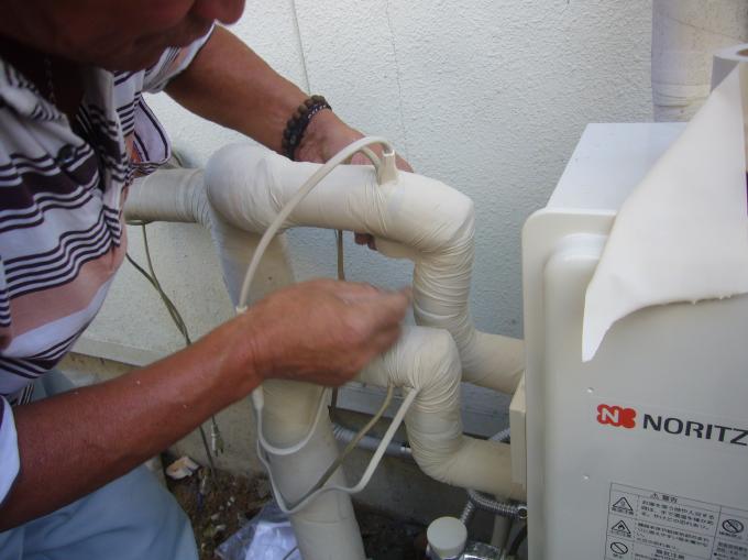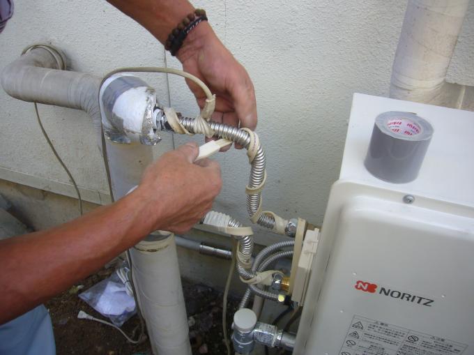| 給水・給湯の接続位置が変わるので、フレキ管で接続し直します。 | 新しい給水・給湯管に凍結防止ヒーターを追加巻きします。 | 凍結防止ヒーターを巻いたところに、化粧の保温ざいを巻きます。 |
