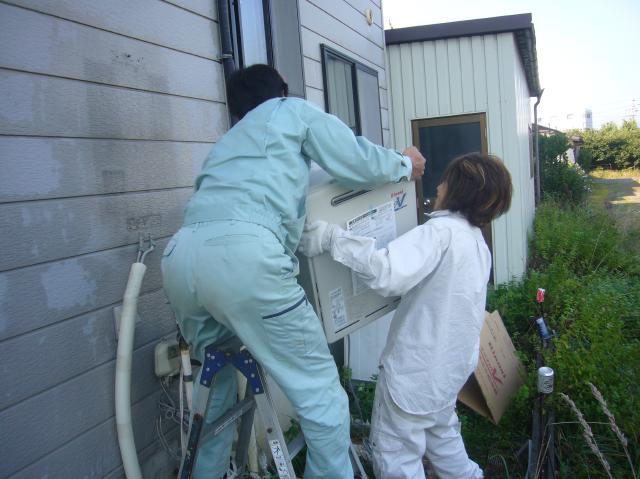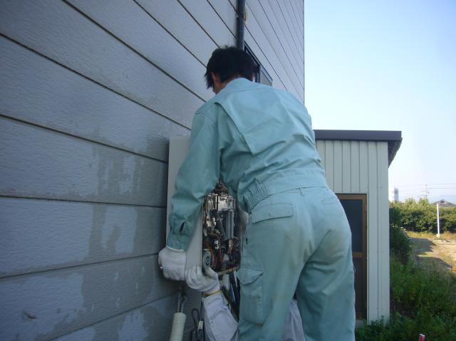 | ガスふろ給湯器の周辺配管・配線を切り離し。 | 本体の取り外しをします。 | 少し高めの位置に取り付けてあるので、手渡しします。 |