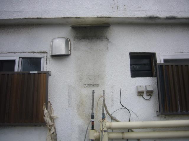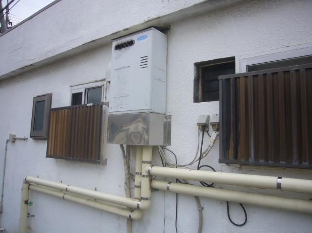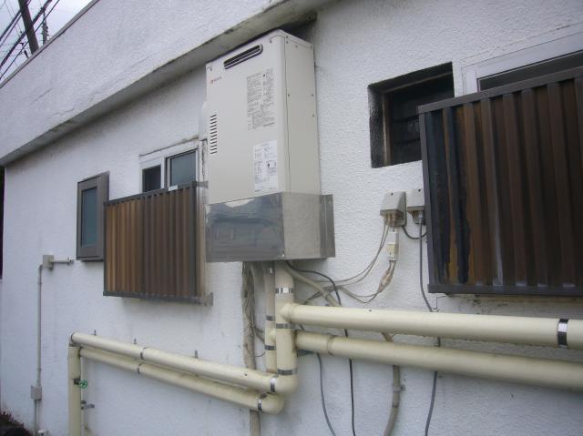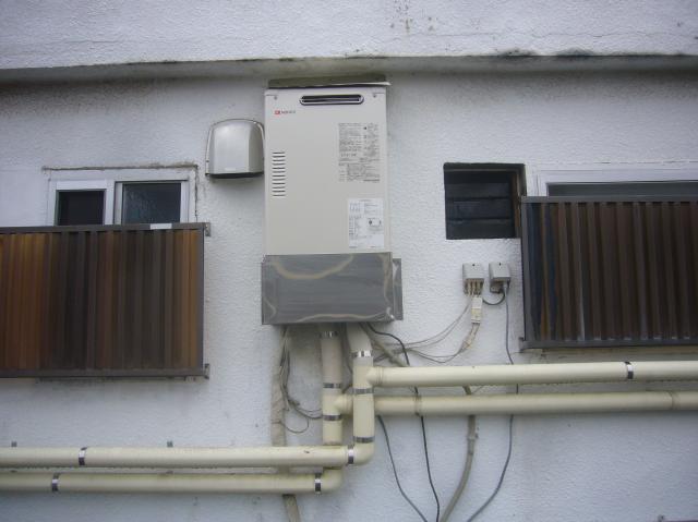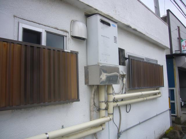 | 道路に面したところに設置されている壁掛形の石油給湯器でした。 | 取付けスペースとしては最適な場所ですね。 | 床設置はできませんね。 |