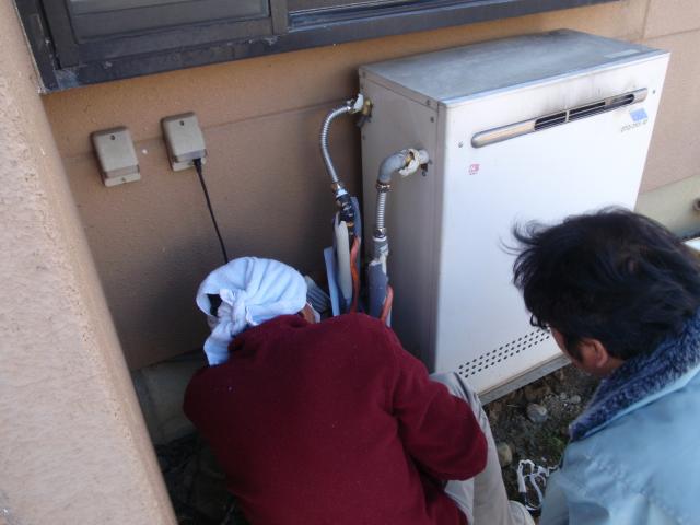 わりと新しめの給湯機でした、直ぐに外して、置き換えて接続です。 |