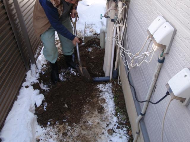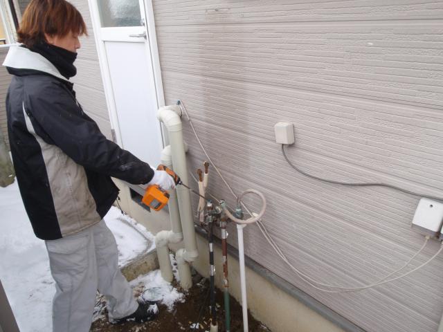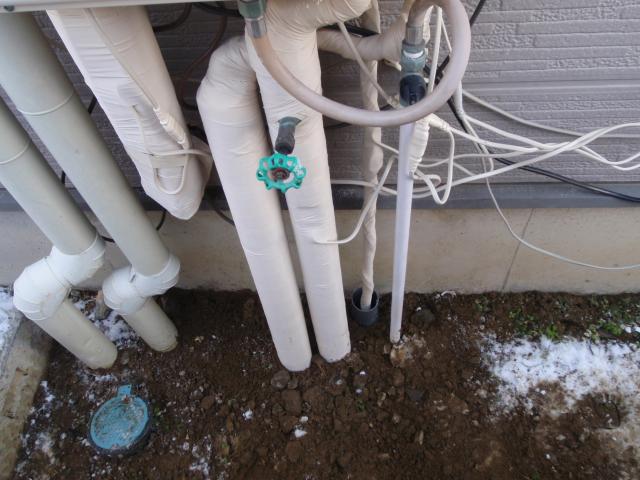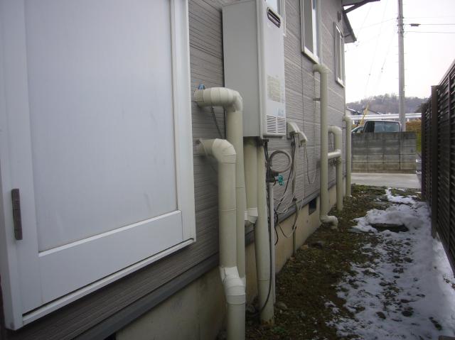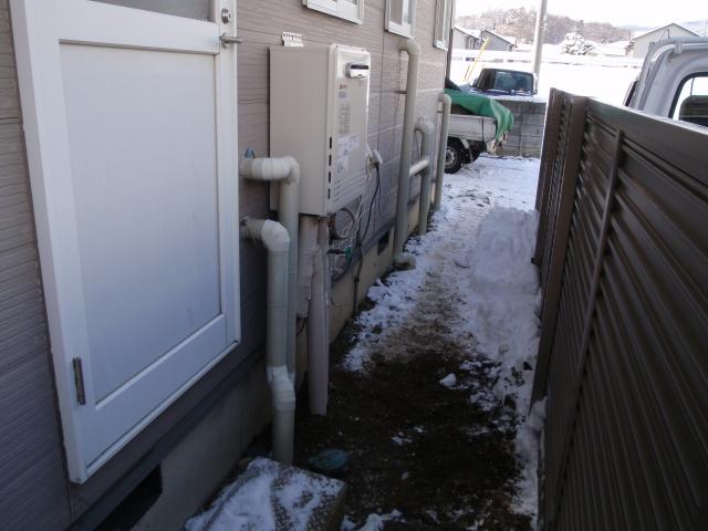 | 配管がスッキリとおさまりました。 | 工事により穴を掘った場所は雪がありませんが、他は寒い、一面の雪です。 | 燃費のいいecoジョーズ これからますます増える事でしょう。 |