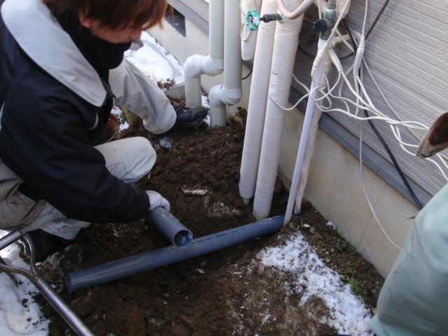| 今回お買いあげいただいた給湯機は(ecoジョーズ)排水管が別に必要になります。 | 下水のトラップマスに穴を開け、排水用の塩ビ管を接続します。その廻りはドレンタイトで穴をふさぎます。 | 土を埋め戻し、整地をして完了です。少ない水でも配管はしっかりやります。 |
