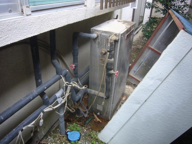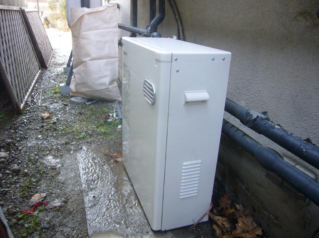 | 本体の撤去かんりょです。 | 本体の撤去完了です。 | 新しい直圧型ふろ給湯器を定位置に設置しました。半分くらいの大きさです。 |